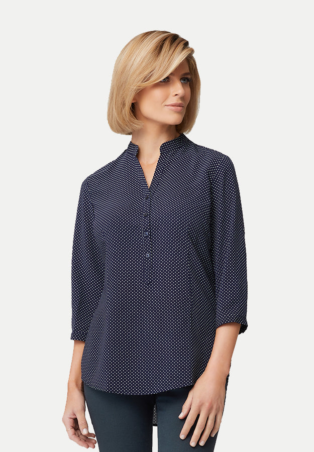 This stylish new City Stretch® Spot Hi-Lo hemline shirt brings a vibrant look to your day-to-day life. Featuring nehru collar, side splits, placket front and gathered back for movement and an overall relaxed fit.