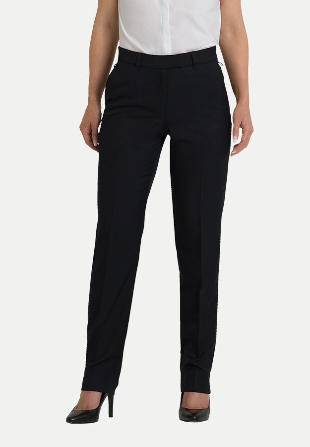 Sleek tapered leg pant with exposed back elastic waist for everyday flexibility and comfort. Includes deep front and back pockets, belts loops, pen and fob pockets.