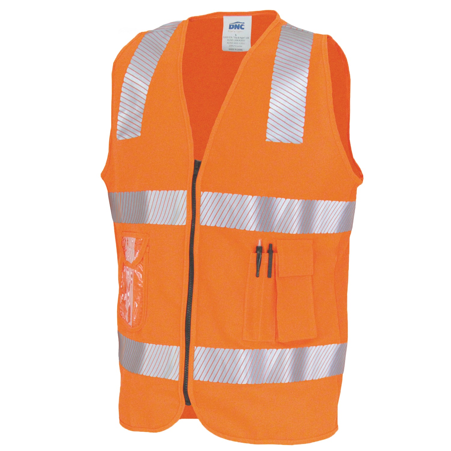 Clear ID pocket, phone & 2 division pen pockets. Two-sided elastic ribbing panel to add more comfort for movement. Zipper closure front. Hook style & shoulder strips front & back. Segmented reflective tape.